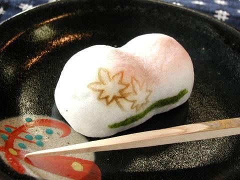 山の上の方からはじまる紅葉が、まだ緑の濃い里の木々に徐々に下りていく。そんな様を写し取った薯蕷まんじゅうです。