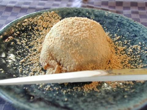 羽二重粉にほんのりニッキを加えて粒あんを包んだお菓子です。まぶしてあるきな粉と絶妙にバランスがよく、この時期のスタッフ一押しのお菓子です。
